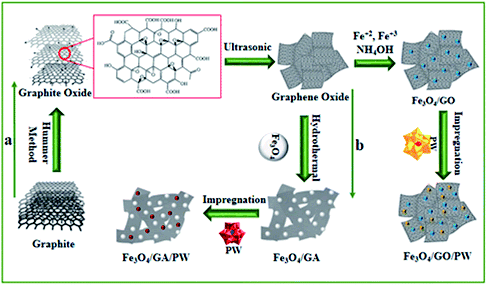 The synthetic process of Fe3O4/GO/PW and Fe3O4/GA/PW are indicated in Scheme 1 in two different ways. Graphite oxide was prepared by oxidation of graphite powder under harsh oxidizing conditions by Hummer's method and was converted to graphene oxide by ultrasonication. In pathway a, the Fe3O4/GO was prepared by chemical coprecipitation method of iron ions. Fe3+ and Fe2+ ions were captured by carboxylate anions on the surface of GO sheets. Then ammonia solution was gradually added to precipitate Fe3O4. Immobilization of Fe3O4/GO with a methanol solution of PW occurs via formation of hydrogen bonding between hydroxyl group on the surface of GO and PW molecule. Fe3O4/GA/PW was prepared by pathway b. Magnetic Fe3O4 NPs were prepared according to the literature using ferric chloride hexahydrate and ferrous chloride tetrahydrate upon addition of NH4OH through the chemical co-precipitation method. GO aqueous suspension was first mixed with reducing agent ethylenediamine and then freshly synthesized Fe3O4 nanoparticles. After hydrothermal treatment, GO was gradually self-assembled into a hydrogel with simultaneous deposition of Fe3O4 nanoparticles. The soft hydrogels, fabricated by the modified hydrothermal method, showed a very small volume shrinkage. Fe3O4/GA aerogel samples after drying were obtained. Afterwards, Fe3O4/GA was used as support for immobilization of PW.