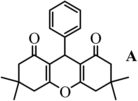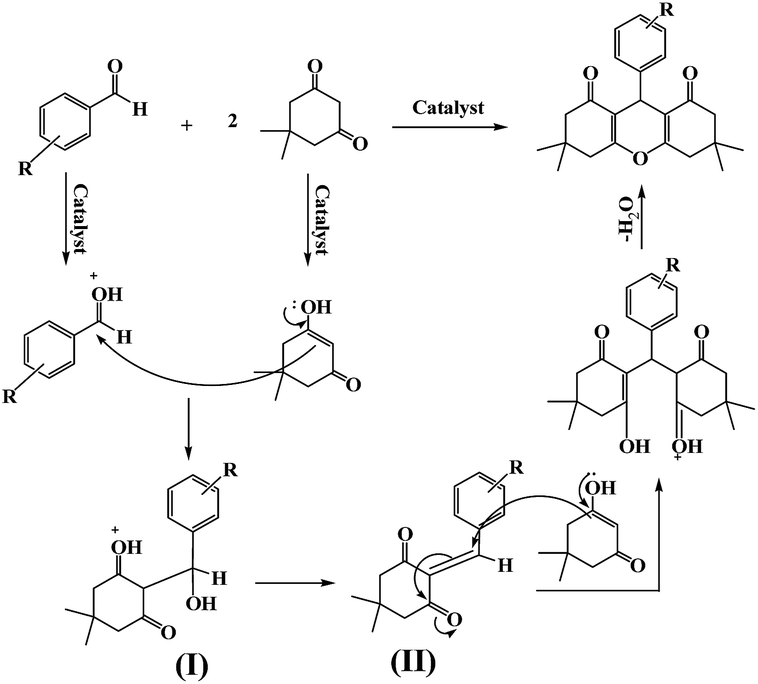 According to the literature63 and results obtained in our experiments, a mechanism is proposed for the synthesis of DOXs as shown in Scheme 3. Initially, the acid catalyst was protonated the carbonyl group of the aldehyde and converted the aldehyde into a convenient electrophile. Then intermediate I was formed via condensation of dimedone with the aromatic aldehyde. Subsequently, intermediate II was produced through combination of a second activated dimedone with intermediate I. Finally, removal of one water molecule of intermediate II led to cyclization and followed by final formation of xanthene products.