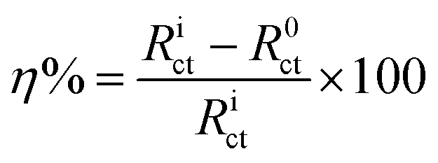 where, i0corr and iicorr are corrosion current densities in the absence and presence of DHPCs, respectively.Electrochemical impedance measurements were carried out at the OCP in the frequency range of 100 kHz to 0.01 Hz using AC signal of amplitude 10 mV peak to peak. The charge transfer resistances were calculated from the Nyquist plots. The inhibition efficiency was calculated using the equation:17