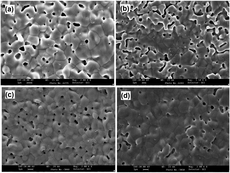 | Fig. 1 SEM micrographs showing of as sintered pellets of (a) CaMn0.98Nb0.01Ta0.01O3, (b) CaMn0.96Nb0.02Ta0.02O3, (c) CaMn0.94Nb0.03Ta0.03O3 and (d) CaMn0.92Nb0.04Ta0.04O3. | ||