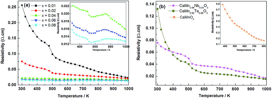 The temperature dependence of electrical resistivity (ρ) of CaMn1−xNbx/2Tax/2O3 (0.01 ≤ x ≤ 0.08) is shown in Fig. 3(a). It is reported in the literature that undoped CaMnO3 shows typical semiconductor like behaviour (dρ/dT < 0) with the resistivity as high as 0.2 Ω.cm at 1000 K (Fig. 3(b) inset). The dual-substituted CaMn1−xNbx/2Tax/2O3 also shows non-metallic nature of transport behaviour at the entire temperature range of 300 to 1000 K. However the ρ values of Nb and Ta dual-substituted CaMnO3 are one order of magnitude lower than that of undoped CaMnO3. The resistivity curves of CaMn1−xNbx/2Tax/2O3 represent characteristic of semiconductor samples in which resistivity decreases with temperature showing the values ρ1000K = 24 mΩ cm for x = 0.01 and ρ1000K = 12 mΩ cm for x = 0.08. The remarkable reduction of electrical resistivity can be attributed to the formation of Mn3+ (t32ge1g) cation in the Mn4+ (t32ge0g) matrix of CaMnO3 due to dual-substitution of Nb5+ and Ta5+. This observation is further supported from the crystallographic analyses that the increase in Mn–O bond lengths with dual-substitution is directly related to the increase of Mn3+ ions as ionic radius of Mn3+ is larger than Mn4+ ions. Based on the valence equilibrium, the formation of an appreciable concentration of Mn3+ introduces free electrons in the eg orbital. The electrons in the eg levels act as a charge carrier in Mn3+–O–Mn4+ framework and reduce ρ through movement of electron by hopping mechanism. On closer look of the resistivity curve, it is observed that there is a shallow region around 500 K. To understand the origin of the shallow region in the resistivity curve, two singly doped compositions of CaMn0.96Nb0.04O3 and CaMn0.92Ta0.08O3 are prepared with high dopant concentration of Nb and Ta, respectively. The resistivity curves of singly doped CaMnO3 show similar semiconductor like behaviour with shallow region around 500 K (Fig. 3(b)). Therefore, the appearance of shallow region is independent of the nature of dopant rather appearing due to high level of electron doping in the CaMnO3 system. Fig. S1 and S2† show the electrical resistivity as a function of temperature for x ≥ 0.06 of CaMn1−xNbx/2Tax/2O3 for both heating and cooling cycles. Although the shallow region around 500 K is more dominant in the heating curve the same is also present in the cooling curve indicating the behavior inherent in nature. Further in the case of CaMn1−xNbx/2Tax/2O3 system, although there is a decrease of resistivity with increasing the concentration of Nb and Ta, the change of resistance is very marginal above x ≥ 0.04. It is well known that the doping level dependence of resistivity is not linear when the doping level exceeds the optimal concentration as other factors starts playing role apart from charge carrier concentrations.41–43 It is well known that the electron doping CaMnO3 system generates oxygen vacancies that acts as a defect centre.44–46 When the electron concentration reaches a certain magnitude, the defect centre may cause the local charge ordering in the system that may be responsible for the anomaly in the resistivity values. The low dopant concentration introduce electrons to the eg level of Mn ions giving rise to electronic delocalization and consequent reduction in resistivity, however, at higher dopant concentration the local charge-ordering clusters form, resulting in the localization of electrons and followed by anomaly in resistivity curve. Therefore, for higher concentration of Nb and Ta the increase in resistivity at 500 K is very prominent than the lower Nb and Ta doping. After sudden increase of few milliohms resistivity saturates and results in the shallow region at the resistivity curve.