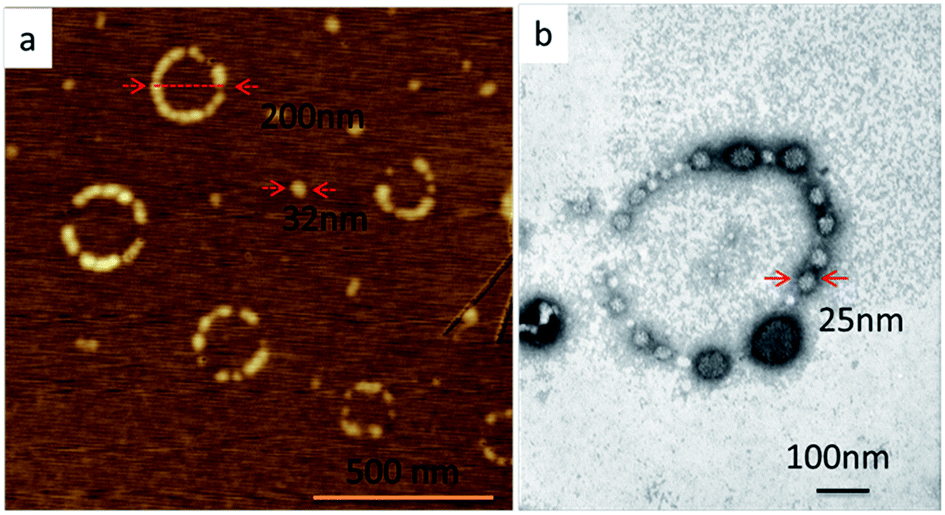 Notably, the ring-shaped nanostructures (necklaces) were also observed in the system of pH at 6.8 (Fig. 2a, b, S6a and S9a†). The observations of spherical micelles and necklaces in the system of pH at 6.8 were further confirmed by the bimodal distribution of the sizes of the nanostructures shown in Fig. S4c.† The average size of the spherical micelles was about 30 nm, which was corresponding to the lower size part of the DLS result (Fig. S4c†). And the sizes of necklaces were at the range of 200–300 nm, which was corresponding to the higher size part of the DLS result (Fig. S4c†). Excitingly, the ring-shaped nanostructures were composed of a series of globular segments (30 nm). The sizes and shapes of these globular segments were the same as those of the individual spherical micelles with cavities. This phenomenon improved us that the necklaces were formed by the connection of the spherical micelles, which could be also demonstrated by the existence of the imperfect necklaces.
