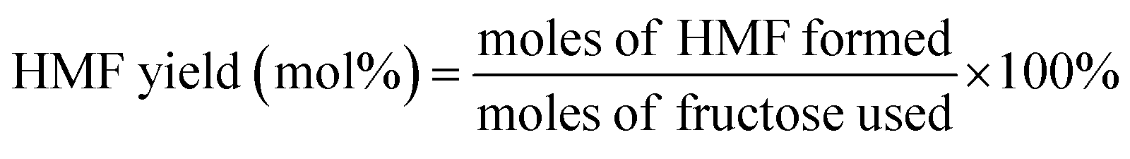 The amount of HMF was analyzed by HPLC with Shimadzu LC-15C pump, Shimadzu UV-Vis SPD-15C detector at 282.0 nm, and a Supelcosil LC-18 5ìm column at 35 °C. Before analyzed, the reaction mixture was diluted to 1000 mL. Methanol/water solution (50/50 v/v) was used as the mobile phase at a flow rate of 0.8 mL min−1. The conversion of fructose was analyzed by HPLC with Shimadzu LC-20AT pump and Shimadzu RID-10A detector with a Benson BP-800 H+ carbohydrate column at 50 °C. Before analyzed, the reaction mixture was diluted to 500 mL. 5 mM H2SO4 aqueous solution was used as the mobile phase at flow rate of 0.6 mL min−1.
