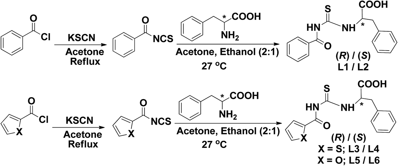 We report here the synthesis and characterization of new chiral aroylthiourea ligands derived from D/L-phenylalanine such as (R)/(S)-2-(3-benzoylthioureido)-3-phenylpropanoic acid (L1/L2), (R)/(S)-2-(3-(thiophene-2-carbonyl)thioureido)-3-phenyl-propanoic acid (L3/L4) and (R)/(S)-2-(3-(furan-2-carbonyl)thioureido)-3-phenylpropanoic acid (L5/L6), and their ester Ru-p-cymene complexes (1–6). These Ru-p-cymene complexes were successfully applied as catalysts for the enantioselective reduction of aromatic ketones to their corresponding enantiomerically enriched secondary alcohols. The in situ transformation of amino acid to amino ester in the presence of [RuCl2(p-cymene)]2 as a catalyst was confirmed.