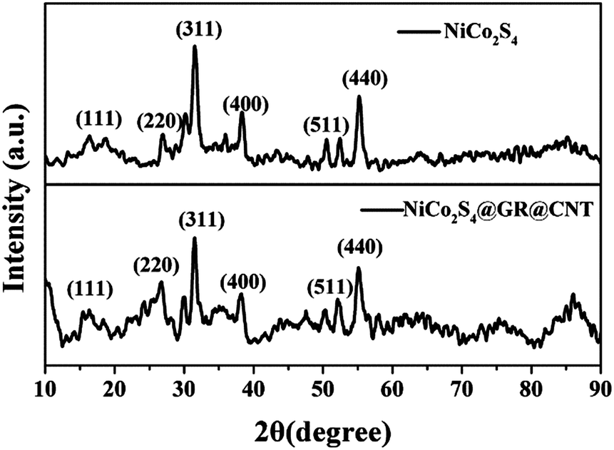 The highly improved capacitances of NiCo2S4@rGO@CNT nanocomposites maybe attributed to their distinctive structure. Firstly, the strong chemical attachment and electrical coupling among the NiCo2S4 nanoparticles, rGO and CNT afford facile electron transport among CNT, rGO and the NiCo2S4 nanoparticles. In addition, the ultra-dispersed NiCo2S4 nanoparticles exceedingly increase the quantity of electroactive sites. Furthermore, rGO sheets overlapped with each other to provide a three-dimensional structure and substantially facilitate transport of the electrolyte. CNTs make the composites be less compact with large specific surface area, and originate the electric double layer capacitance with high conductivity.