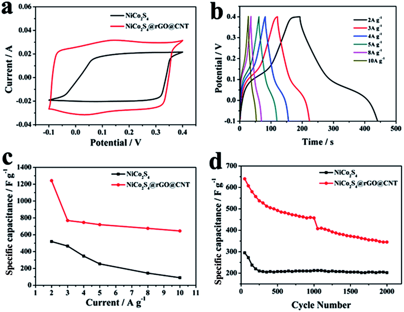 To evaluate the electrochemical performance of the NiCo2S4 and NiCo2S4@rGO@CNT, the electrochemical properties of as-prepared NiCo2S4 and NiCo2S4@rGO@CNT nanocomposites were firstly investigated by using a three-electrode cell. Fig. 7a shows typical cyclic voltammetry (CV) curves of the electrodes made with the materials and tested in 6 M KOH electrolytes at 5 mV s−1. NiCo2S4@rGO@CNT nanocomposites show a much higher current in a potential window of −0.1 to 0.4 V (vs. Hg/HgO), which reveals that the electrochemical performance characteristics mainly resulted from faradaic pseudocapacitance related to Co2+/Co3+ and Ni2+/Ni3+ redox couples.