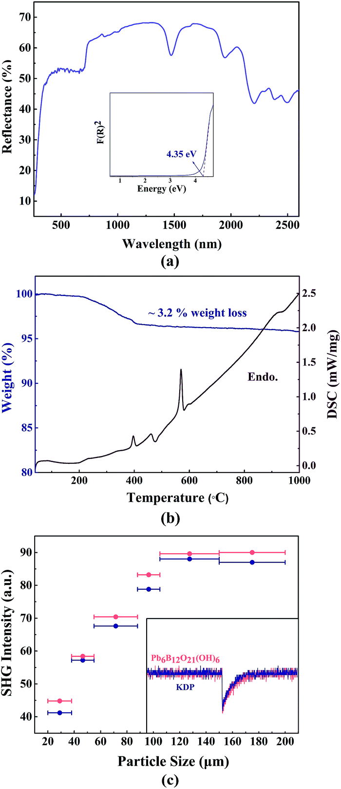| | Fig. 3 (a) UV-Vis-NIR diffuse reflectance spectrum of Pb6[B4O7(OH)2]3. The inset is absorption (K/S) data calculated by Kubelka–Munk function of Pb6[B4O7(OH)2]3. (b) TG/DSC curves of Pb6[B4O7(OH)2]3. (c) Powder SHG response curves of Pb6[B4O7(OH)2]3 and KDP. The inset is oscilloscope traces of the SHG signal for the powders with particle size of 105–150 μm. | |