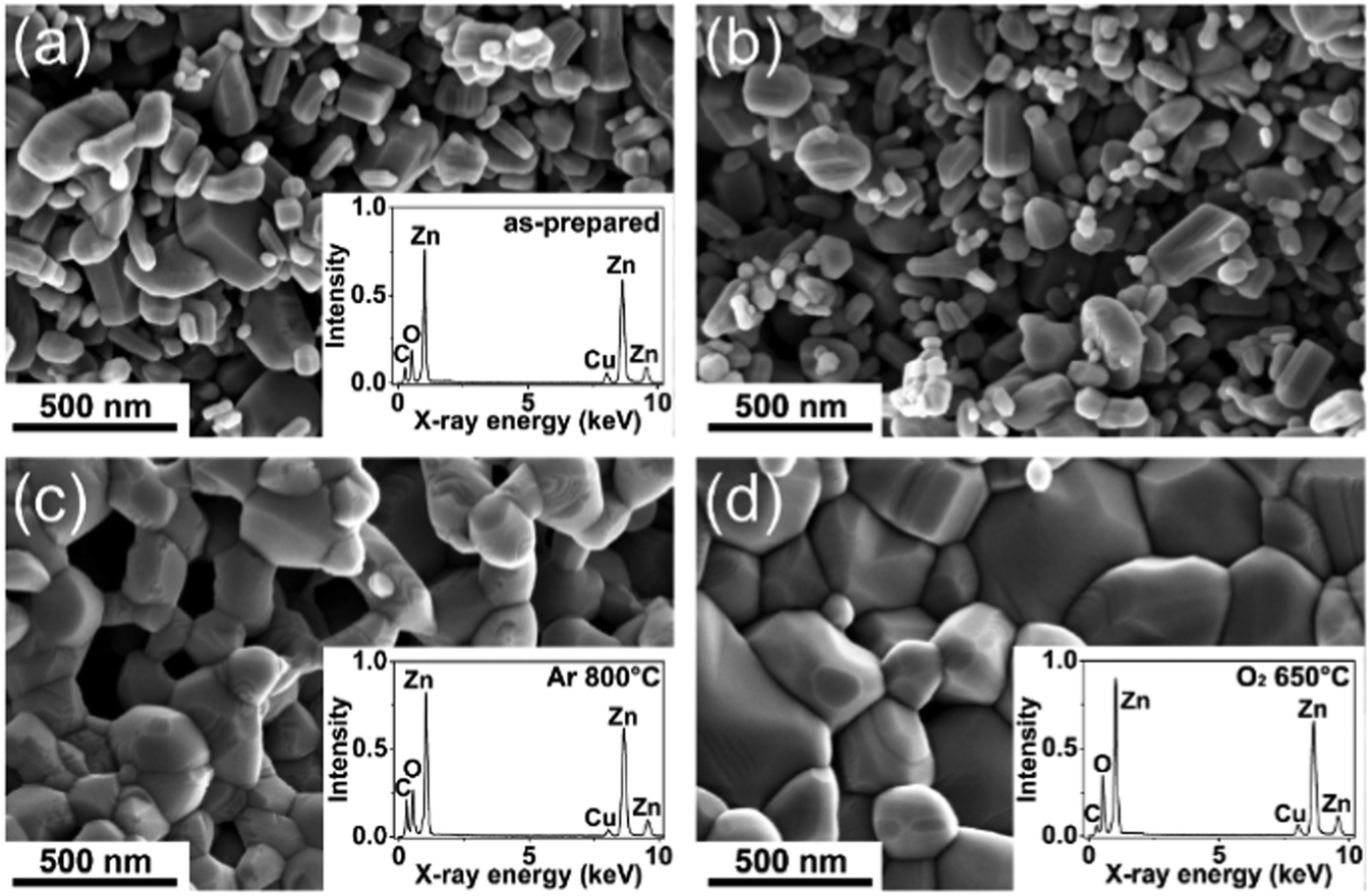XRD patterns of the ZnO samples are summarized in Fig. 2, where all resolved XRD peaks can be indexed to the wurtzite phase of ZnO (space group P63mc; lattice parameters a = 3.245 Å and c = 5.207 Å), consistent with the values in the standard card (JCPDS card No. 36-1451). No other phases from impurities were detected within the resolution limits.