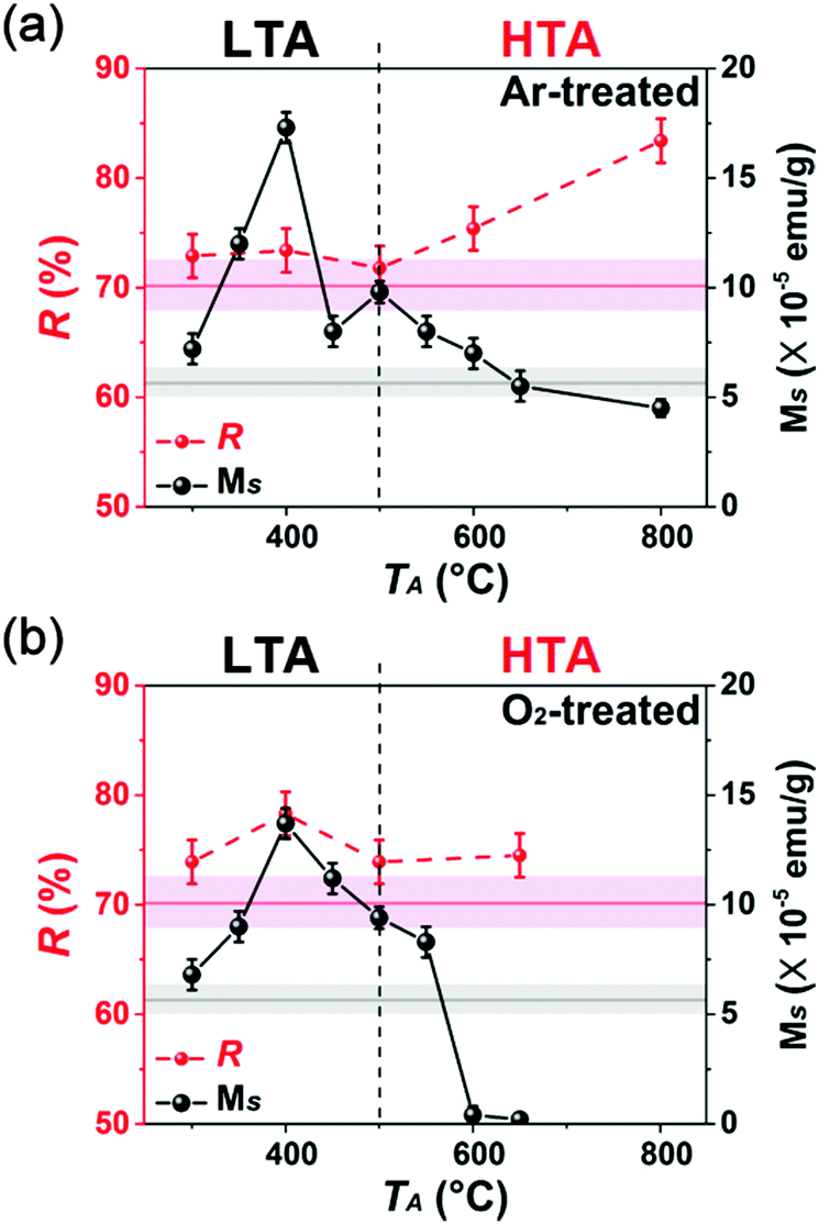 , (see Fig. 5), where IO1s_LBE and IO1s are the integrated intensities of the lattice oxygen component and the total O 1s peak. The large R value represents a high level of partial dehydrogenation at the surface and vice versa. Fig. 7 shows that the R and the corresponding Ms curves of the LTA groups reveal a similar trend and peak at the same TA (400 °C). In contrast, the effect of surface dehydrogenation is obviously not important for HTA groups, most likely due to larger grain size. The results here are in good agreement with the theoretical prediction given in ref. 27. Based on their model, surface dehydrogenation could induce electron redistribution between Zn and O atoms ‘only’ in the ZnO nanosystem, leading to ferromagnetic ordering at the surface. Note that the values presented here are taken from the spectra collected at α = 71.75° (more surface-sensitive). The error bars of ±10% represent the experimental uncertainty including fitting procedures and extrinsic carbon contamination (i.e. carbonyl group).