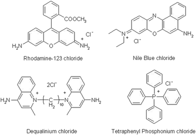 | Fig. 2 Typical delocalized lipophilic cations (DLCs): rhodamine-123 chloride, nile blue chloride, dequalinium chloride and tetraphenylphosphonium chloride. | ||