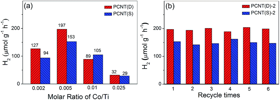 | | Fig. 7 Photocatalytic H2 evolution of PCNT(D) and PCNT(S) versus different amounts of Co (a), and photocatalytic H2 evolution in six-run recycling experiments using PCNT(D)-2, and PCNT(S)-2 composites (b). | |
