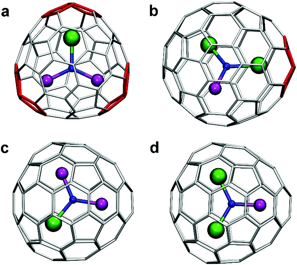 ‡ Fullerene cages are denoted following the spiral algorithm.13 For the cages with adjacent pentagon pairs (non-IPR), the full numbering system is used. For IPR cages, more common abridged system counting only IPR isomer is employed. |