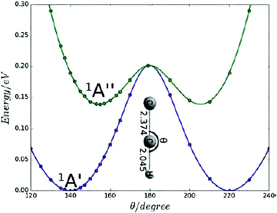 | | Fig. 1 One-dimensional cut of the 3D PES of the C2H+(11Π) state along the bending coordinate. RCC and RCH are fixed at their equilibrium values. The reference energy is the energy of the 11Π(1A') component at equilibrium. (Reproduced from DOI: 10.1039/c8fd00091c with permission from the Royal Society of Chemistry.) | |