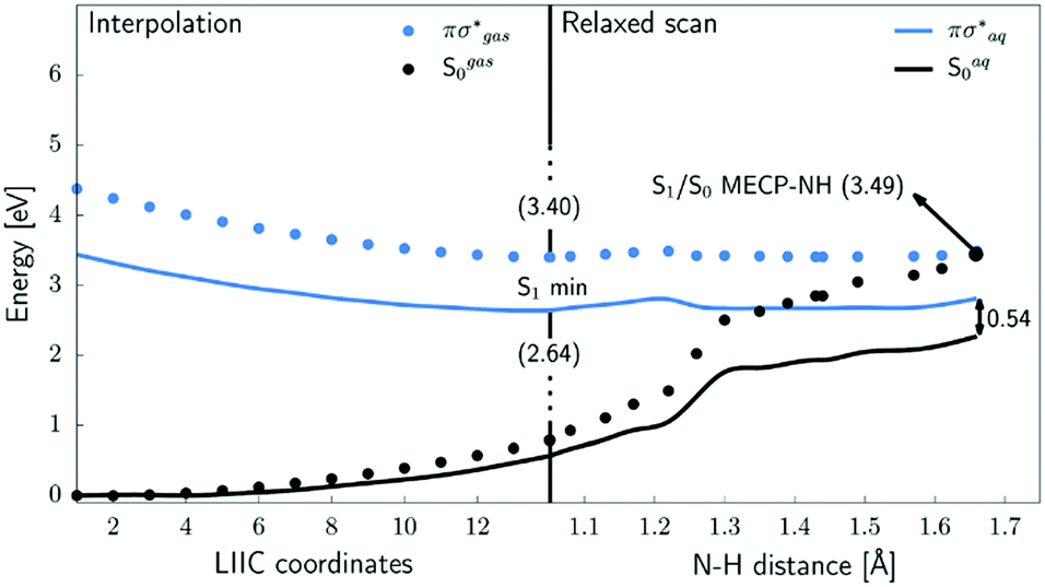 | | Fig. 3 Photorelaxation of the πσ* state via the conical intersection with the ground S0 state for the case of 2-AIM (dotted line) and 2-AIM-(H2O)5 (full line). Reproduced from DOI: 10.1039/c8fd00086g with permission from the RSC. | |