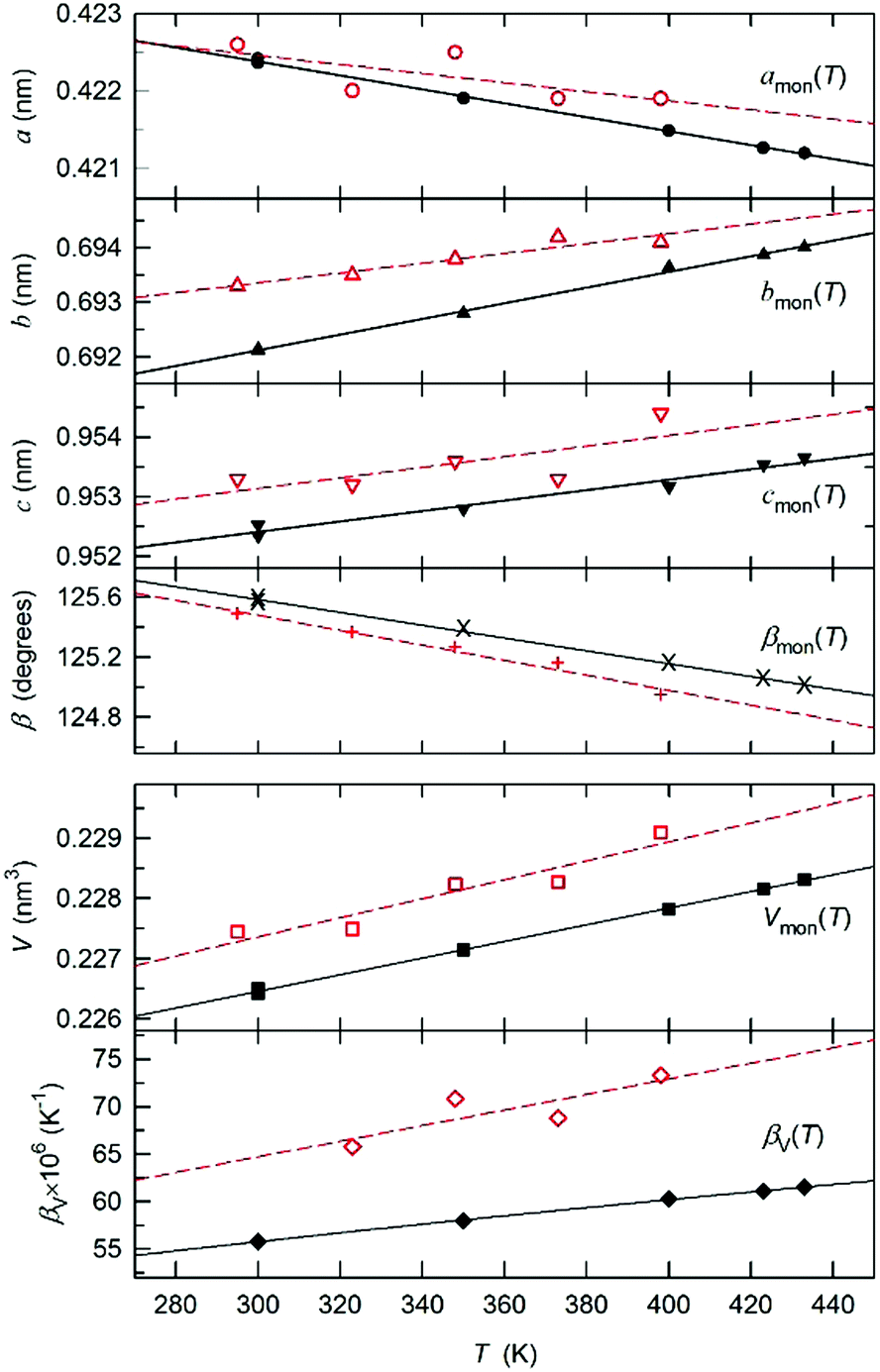 | Fig. 4  The effect of temperature T on the unit cell parameters a, b, c, β, and volume V, and on the volumetric thermal expansion coefficient βV of coarse- and nanocrystalline acanthite. The approximation of the experimental data by the solid line and the closed symbols (●), (▲), (▼), (×), (■), and (♦) corresponds to coarse-crystalline acanthite and the approximation by the dotted line and the open symbols (  ), (  ), (  ), (  ), (  ), and (  ) corresponds to nanocrystalline acanthite. Reproduced from ref. 1 with permission from Springer. | ||