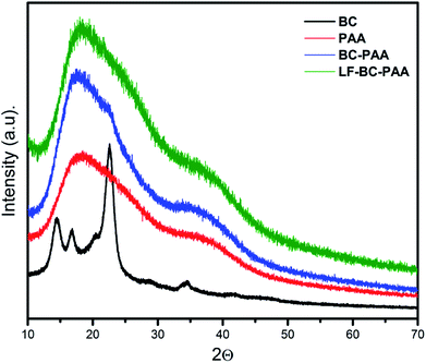 The XRD diffraction patterns of control composite xerogels (BC-PAA and LF-BC-PAA) are compared in Fig. 4 to that of simple BC and PAA alone. The bacterial cellulose is a semi-crystalline material that usually produces three major characteristic crystalline peaks: at 2θ – 14.2 and 22.7 along with a weak middle peak at 16,6 corresponding to the (1−10), (200) and (110) crystalline planes of the cellulose 1β structure.48 The structure of PAA is amorphous and presents a broad peak at 2θ – 17.8. Further on, analysing the XRD pattern of the composite xerogels (BC-PAA and LF-BC-PAA), broad peaks related to PAA were spotted at 2θ – 17.6 and 17.9, respectively. However, the characteristic peaks of crystalline BC disappeared and a hump, characteristic for amorphous zones, appeared instead. The reason for this observation is simple. The network interpenetration of PAA with BC resulted in the destruction of the specific crystalline regions of BC alone;49 and thus, confirming the proposed polymerization mechanism that led to the formation of IPNs.50