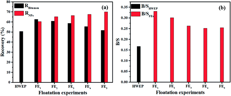 | Fig. 6 (a) Recovery of bitumen and NPs in floatation experiments and (b) the corresponding B/S of froth from different extractions. | ||