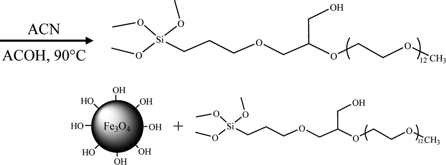 Accordingly, in this work, we want to synthesize a multifunctional nanoparticle, possessing nano-size effect, chemical surface activity and recyclability. We plan to synthesize the Fe3O4 NPs which are grafted by a hydrophilic materials (i.e., polyethylene glycol 600 (PEG600)). This grafting will make the surface of Fe3O4 NPs more hydrophilic, leading to its high dissolution and stabilization in water. Therefore, the purposes of this work are to: (i) synthesize PK-grafted Fe3O4 NPs and prepare PK-Fe3O4 NPs-based NFs; (ii) test the feasibility of PK-Fe3O4 NFs in separating bitumen from oil sands and (iii) understand the primary roles of PK-Fe3O4 NFs in oil–mineral separation.