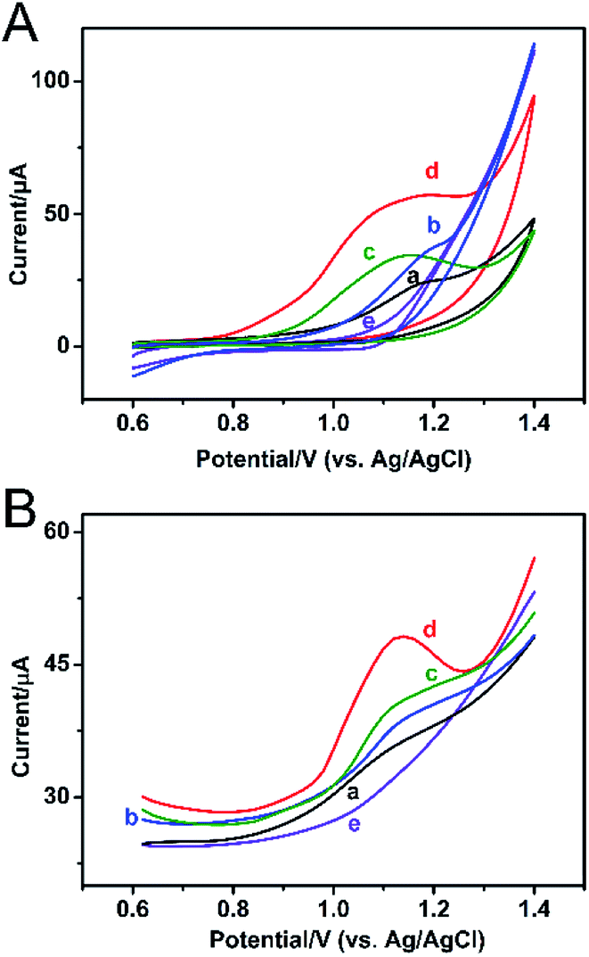 | Fig. 2 (A) CV and (B) DPV curves of the bare Pt electrode (a), ERGO/Pt electrode (b), PtNF/Pt electrode(c), PtNF/ERGO/Pt electrode (d) in the presence of 500 μM SA, and the PtNF/ERGO/Pt electrode (e) in the PBS without SA. | |