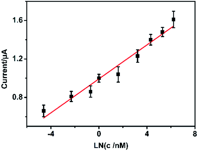 The modified electrode was used to detect different concentrations of SA standard solution using DPV method. As shown in Fig. 4A, with the increasing concentrations of SA, the peak current of SA increases correspondingly. There is a decent linear relation between the peak currents and the logarithm value of the concentrations of SA from 100 pM to 1 μM (Fig. 4B). And the equation is Ipeak (μA) = 0.45LNCSA (nM) + 1.05, the correlation coefficient is 0.9807. The detection limit of this sensor is 48.11 pM (S/N = 3.0). The sensing performance of the PtNF/ERGO/Pt microsensor for SA is compared with the previous reports. As shown in Table S1,† the developed sensor in this work is superior to most electrochemical sensors existed for SA.2,11,29–33
