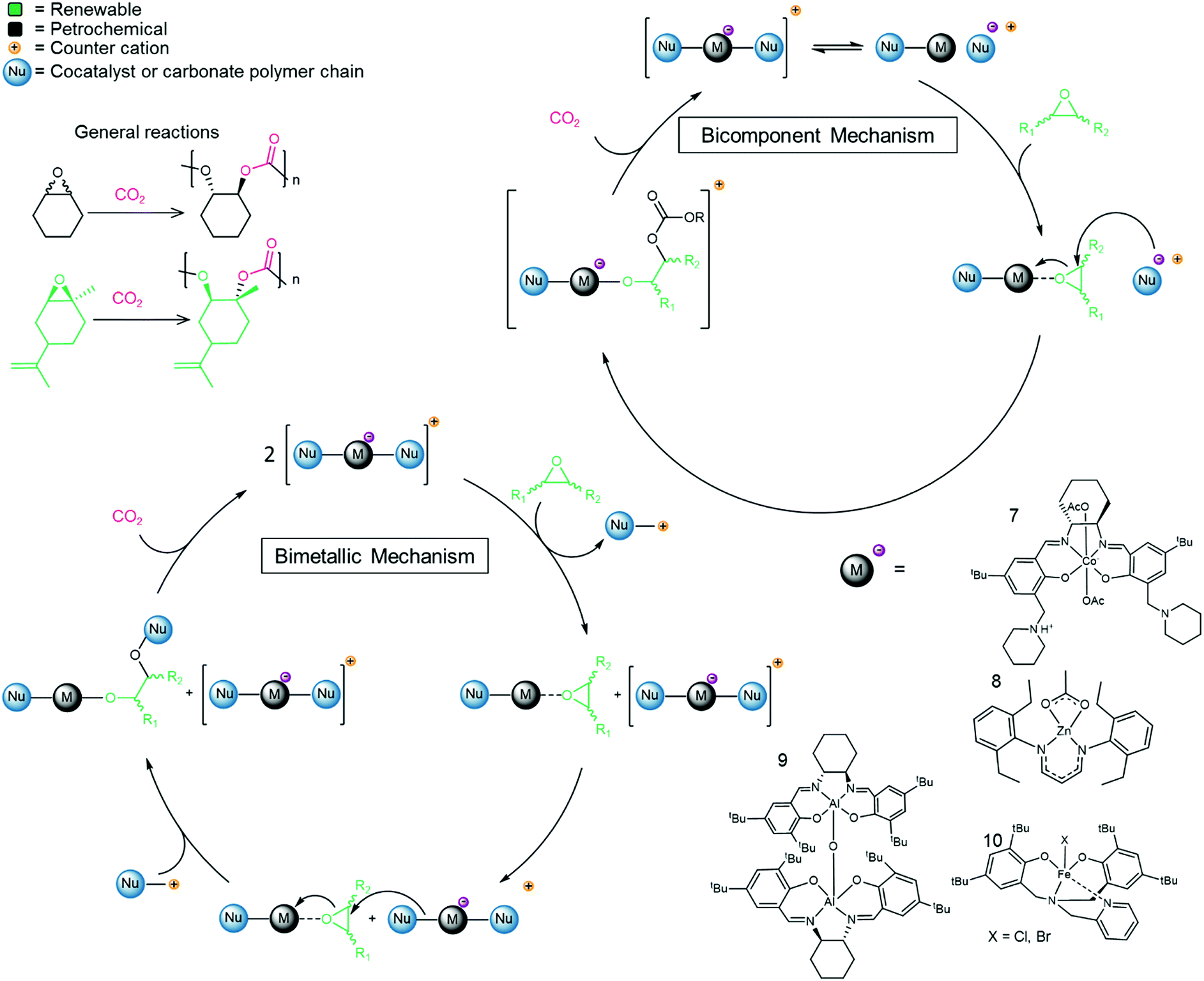 | Fig. 3 Co-polymerization of epoxides and CO2 to afford pCs, representative catalysts and the generally accepted bicomponent and bimetallic catalytic cycles.64,74,78,97,98 | |