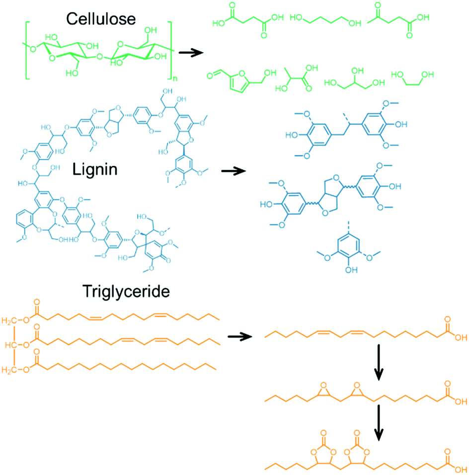 | Fig. 8 Examples of alcohols/diols derived from cellulose and lignin (top, middle) after hydrogenation/hydrogenolysis reaction. Example of a carbonated vegetable oil (linoleic acid, bottom) obtained from a natural triglyceride. | |