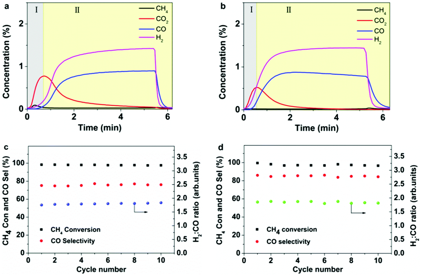 CO ratios stabilized at ∼1.8 (Fig. 3c) and ∼1.9 (Fig. 3d), i.e., close to the typically desired ratio for downstream Fischer–Tropsch or methanol synthesis. The CO selectivity for 5Ni/CeO2–TiO2 in the isothermal MDR-STCDS and MDR-STWS processes amounted to ∼76 and ∼85%, respectively, which is most likely due to the different surface oxygen species as will be discussed later. To summarize, the extraordinary CO2 and H2O splitting performance and the superior CH4 partial oxidation activity render 5Ni/CeO2–TiO2 a highly promising redox catalyst in the MDR-STCDS and MDR-STWS processes.