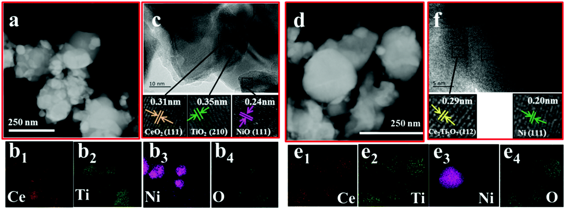 The elemental distribution and structure of the 5Ni/CeO2–TiO2 catalyst were further characterized by STEM-EDX and HRTEM techniques and the results are indicated in Fig. 9. For the initial catalyst, STEM-based EDX mapping (Fig. 9b1–b4) showed an inhomogeneous distribution of the elements with distinct Ce, Ti, and Ni rich regions (see Fig. S10, ESI† for more details). The corresponding HRTEM images exhibited well-resolved lattice fringes of 0.31, 0.35, and 0.24 nm, which can be ascribed to CeO2(111), TiO2(210), and NiO(111) facets, respectively (Fig. 9c). The above results further confirm the intimately mixed oxides of CeO2, TiO2, and NiO in the as-prepared catalyst. In contrast, elemental mapping for 5Ni/CeO2–TiO2 after reduction with CH4 (Fig. 9e1–e4) demonstrates clearly that the distributions of Ce, Ti, and O overlap with each other, whereas Ni was at oxidation state Ni0 as no clear O element was identified within the same region. Besides, clear lattice fringes of 0.29 and 0.20 nm corresponding to (112) Ce2Ti2O7 (JCPDS 00-047-0667) and (111) Ni (JCPDS 00-001-1272) structural domains, respectively, were revealed (Fig. 9f). These results thus provide unambiguous evidence that TiO2 was incorporated into the CeO2 lattice, resulting in Ce2Ti2O7 pyrochlore, while NiO was reduced to metallic nickel after CH4 reduction, in accordance with the XRD analysis. However, the distribution of Ce and Ti remained inhomogeneous for CeO2–TiO2 before and after the MRD step (Fig. S11, ESI†), indicating the incorporation of TiO2 into CeO2 appeared to be negligible. Additionally, STEM-EDX mapping of 5Ni/CeO2–TiO2 catalysts after MDR-STCDS and MDR-STWS redox cycling verified a homogeneous distribution of Ce, Ti, and O elements (Fig. S12, ESI†), implying that CeO2 and TiO2 were regenerated with a homogeneous dispersion, with Ni species dispersed on the CeO2–TiO2 matrix. In essence, the STEM-EDX mapping and HRTEM analysis visualized the crystalline phase evolution of the 5Ni/CeO2–TiO2 catalyst, i.e., the as-prepared catalyst existed in the form of mixed oxides, which transformed into Ce2Ti2O7 pyrochlore and metallic Ni after the MDR step and regenerated with uniformly distributed CeO2 and TiO2 upon CO2 or H2O splitting.