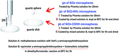 3 concentrated H2SO4/30% H2O2) for 20 min to form –OH groups on the surface as that of the SiO2 microsphere. In order to simulate the SiO2–NH2 and SiO2–COOH microspheres further, the mixed solution A (methylbenzene solution with 5 wt% γ-aminopropyl-triethoxysilane) and mixed solution B (dimethylformamide solution with 20 wt% equimolar γ-aminopropyl-triethoxysilane and butanedioic anhydride, reacting at 80 °C for 5 h), as the reaction solutions used in surface modification of the microsphere, was coated on the surface of the piranha solution treated sphere and disk respectively. After that, the coated sphere and disk were kept at 80 °C for 5 h and then vacuum dried for 2 h. Through the treatment, the thickness of the surface covering layer of the sphere and disk reached 0.2–0.5 mm (the scheme is shown in Fig. 2). When testing the friction of the microspheres in q special medium, the corresponding medium was dropped on the surface of the disk and spheres to wrap the test interface for a better simulation of the real situation.