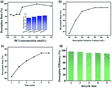 | | Fig. 8 (a) Influence of the concentration of HCl solution and the kind of desorption solution (inset) on the desorption efficiency; the influence of desorption solution volume (b) and desorption time (c) on the desorption efficiency; (d) desorption and regeneration of the as-prepared sorbent. | |
