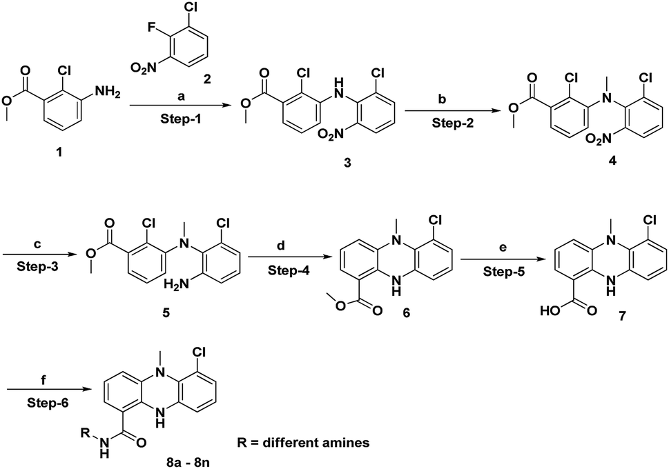 The synthesis of the dermacozine-1-carboxylic acid 7 and its derivatives was achieved in 6 steps, as shown in Scheme 1.10 The commercially available methyl 3-amino-2-chlorobenzoate 1 was treated with 1-chloro-2-fluoro-3-nitrobenzene 2 in the presence of LiHMDS at −78 °C to afford the methyl 2-chloro-3-((2-chloro-6-nitrophenyl)amino)benzoate 3.11 Methylation of 3 with MeI in the presence of NaOH afforded the N-methyl intermediate 4. Then, the reduction of the nitro group was performed using Fe–NH4Cl at reflux temperature to furnish 5. After this, intramolecular cyclisation of 5 was conducted under Buchwald conditions in the presence of Johnphos, pd2 (dba)3 and Cs2CO3, at 120 °C under sealed conditions. Then, hydrolysis of the methyl ester 6 to the acid 7 was performed using 4 N NaOH at room temperature, as shown in Scheme 1. The amide derivatives 8a–8n were synthesized in good yields by treating the acid 7 with 14 different amines using HATU–DIPEA at room temperature (Fig. 1).
