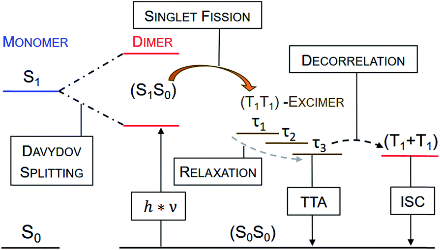 Strong intermolecular π–π interactions, then, lead to inter-chromophore coupling and Davydov splitting. More specifically, Davydov splitting arises from the overlap of the wavefunctions of two translationally inequivalent molecules in the unit cells of crystals.46,50 To be consistent with previous reports on acene dimers,51–54 we refer to Davydov splitting rather than the synonymous exciton splitting.55 Excited-state properties and dynamics that lead to Davydov splitting have been reported for e.g., polycrystalline single crystals,50 acene films,56 and nanoaggregates.57,58 Davydov splitting of the lowest singlet excited state has been predicted for pentacene crystals to lead to an electronic situation that is favorable for fast SF.59 Importantly, it has been shown for crystalline perfluoropentacene that excimer states formed from Davydov states act as intermediates that favor SF, rather than compete with it.60 For films of diketopyrrolopyrroles with marked Davydov splitting, excimer states formed on photoexcitation have been identified as a multi-excitonic 1(T1T1) state en route to triplet decorrelation.61