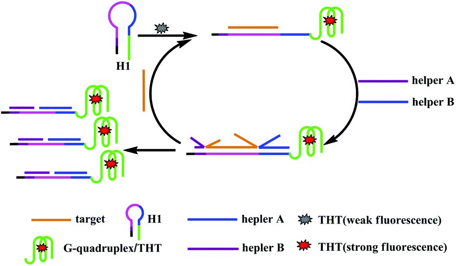 Herein, we report a label-free, enzyme-free, and sensitive THT-based strategy in combination with a continuous amplification cycle for DNA detection. As a proof-of-concept, HIV DNA, which is one of the major causes of death in HIV-infected patients,33 was chosen as the model in this study. In this sensing platform, THT was selected as the detection signal source. The fluorescence from free THT is weak, but the fluorescence increases when THT combines with a G-quadruplex. The sensing system contains H1 and two single-stranded helper probes (helper A and helper B). The hairpin structure of H1 can be opened by HIV DNA and the strand displacement amplification can be promoted by helper probes. Moreover, due to the problem of slow reaction kinetics of the current enzyme-free amplification strategy, two auxiliary chains are used instead of a second hairpin, which not only ensures a low fluorescence background, but also promotes the amplification cycle of the entire system, and the problem of opening of multiple hairpins hindering the reaction kinetics can be avoided. Through this continuous amplification cycle, large quantities of G-quadruplex structures are produced, leading to a significant enhancement of fluorescence after association with THT. Thus, highly sensitive detection of targets can be achieved by monitoring the change in the fluorescence signal. The total reaction was carried out in a uniform solution without a complicated reaction process or the time-consuming cyclic reaction. The detection time is only 40 min, because cyclic amplification involves only one DNA hairpin and two auxiliary chains. Moreover, this detection platform could potentially be used in applications that detect other specific targets.