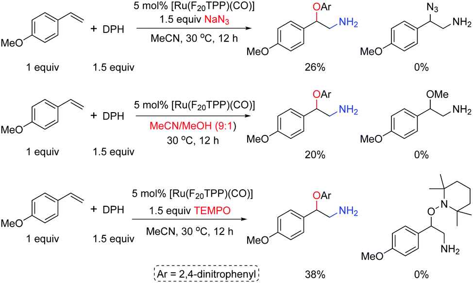 In the presence of [Ru(F20TPP)(CO)], adding 2,2,6,6-tetramethylpiperidine nitroxide (TEMPO, 1.5 equiv.) to the reaction of 4-methoxy styrene 1a and DPH (1.5 equiv.) in MeCN at 30 °C decreased the product yield of 3a from 78% to 38%; adding NaN3 as an extra nucleophile or using a mixed solvent MeCN/MeOH (9: