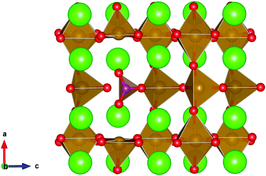 Carbonate incorporation simulations were performed using the super cell method with a 6 × 6 × 6 unit cell size. The mechanisms and corresponding incorporation energies for carbonate in pure cubic SrFeO3 are unfavourable as can be seen from results in Table 7. Our simulations suggest that it is unlikely that any carbonate incorporation mechanisms will occur naturally in cubic strontium ferrite unless it contains iron vacancies and surrounding oxygen vacancies as shown in Table 8. If one assumes existing vacancies however, the carbonate incorporation becomes favourable and the carbonate group is positioned on the iron site and parallel to the plane formed by the oxygen vacancies, as displayed in Fig. 6.