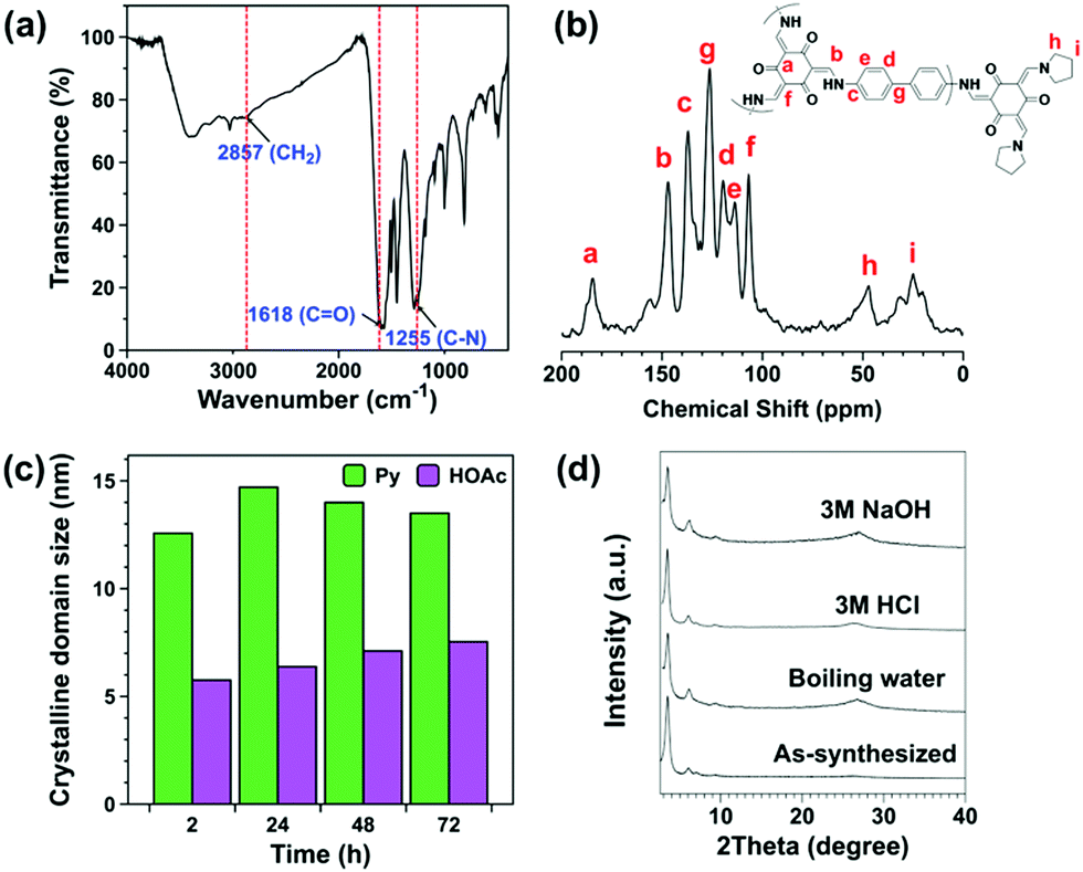 PXRD patterns demonstrated that the resulting COFs synthesized in the presence of Py had a typical hexagonal lattice as previously reported using an HOAc aq. catalyst (Fig. S1 in the ESI†).11 All the diffraction peaks could be indexed to the (100) plane at 3.5°, (110) at 6.1°, (200) at 7.1°, (210) at 9.3° and (001) at 26.3°, respectively. Compared with the acidic system, the Py-assisted synthesis remarkably improves the crystallinity of the products (Fig. S2 in the ESI†). As shown in Fig. 1c, the average size of the (100) domain determined by Scherrer analysis17 reaches 12.6 nm just at 2 h, which is almost double that of the COFs using an HOAc catalyst (5.8 nm). Furthermore, as the reaction was prolonged, the (100) crystalline domains were kept in the range of 13–15 nm. In contrast, the acid-catalytic crystallization gradually evolved in 72 h and eventually, the size of the crystalline domain was achieved to be as low as 7.5 nm. This implies that Py alters the reaction kinetics, which may facilitate the self-improvement of ordered structures. Then the chemical stability was testified by suspending the TpBD-COF powders in 3 M HCl, 3 M NaOH aq. and boiling water, respectively, for 7 days. It can be seen that all of the PXRD patterns remained, indicative of the stability of β-ketoenamine linkages (Fig. 1d). Additionally, the treated solids could keep the original weights (>98%) and the remaining solutions were analysed by FT IR measurement, revealing that a trace amount of Py was present after the treatment of COFs with the given solutions (Fig. S3 in the ESI†). This may be attributed to the elimination of the terminal Py moiety on the frameworks.