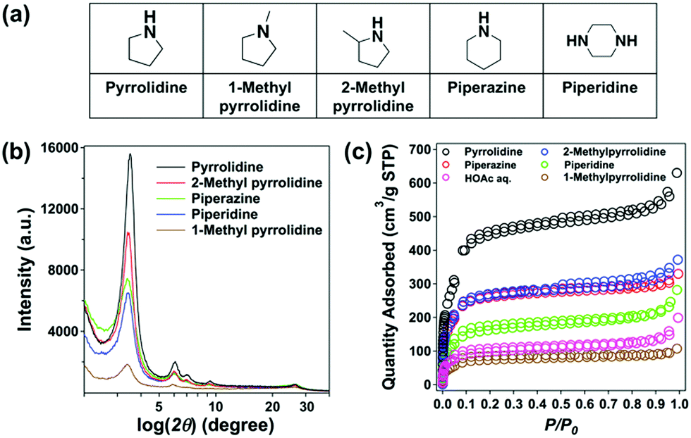 Next, we adopted a variety of organobases including piperidine, piperazine, 1-methylpyrrolidine and 2-methylpyrrolidine for the synthesis of TpBD-COF under otherwise identical conditions (Fig. 2a). All of them provided similar PXRD patterns, while the signal intensity at the main peak (3.5°) was considerably different (Fig. 2b). 1-Methyl Py, which is the tertiary amine, conferred the weakest X-ray diffraction intensity. Among the secondary cyclic amines, the five-membered Py was much more efficient than the six-membered piperazine and piperidine for the COF's crystallization. Additionally, 2-methyl Py led to a slightly weaker crystallinity than Py probably due to its steric hindrance effect.