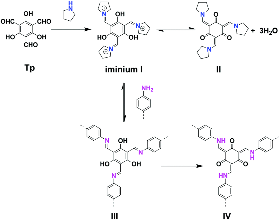 The typical catalyst for the synthesis of β-ketoenamine-linked COFs is acetic acid aqueous solution (6 M), which can activate carbonyl groups to undergo the nucleophilic reaction with amines. As an alternative, it has been reported that amino-catalytic methods are available for the direct preparation of aldimines by a transimination between iminium ions and amines (Scheme 1b).16 This motivated us to study the structural evolution of β-ketoenamine-linked COFs in a pure organic system without addition of acidic aqueous solution.