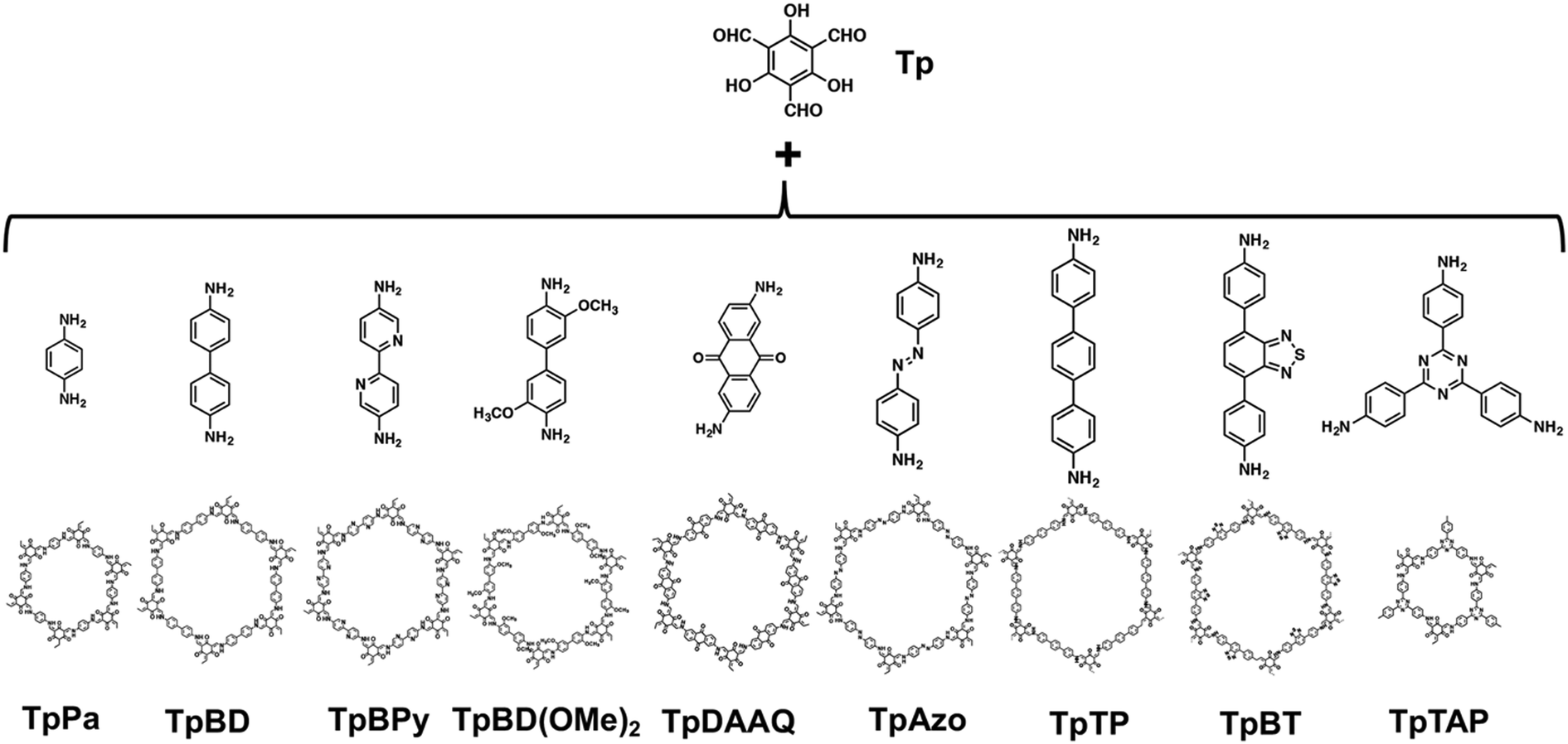 To corroborate the adaptability of organobases for the various β-ketoenamine-linked COFs, we expanded the amine monomers to react with Tp. Table 1 displays the nine kinds of COFs synthesized using Py and HOAc (6 M aq.), respectively, under otherwise identical conditions. It is evident that their crystallinity and porosity are significantly different (Fig. S7 and S8 in the ESI†). In many cases, Py is better than HOAc (6 M aq.) for crystallizing the COFs. The resulting COFs including TpBD, TpBD(OMe)2, TpAzo, TpTP, TpBT and TpTAP can give larger BET surface areas than the acid-catalysed counterparts. Furthermore, it is noted that Py appears to be more efficient for the synthesis of TpBT COF that is challenging when using HOAc.18 Meanwhile, we are aware that the surface areas of TpPa COF are similar to those obtained in the acid or base system, whereas for TpBPy and TpDAAQ, the use of Py leads to relatively smaller surface areas. It was observed that the addition of Py largely improved the solubility of amine monomers in a mixed organic solution because of the H-bonding interaction between Py and the proton-accepting moieties, i.e. BPy and DAAQ. Thus, the reaction may be accelerated and unfavourable for crystallization based on a slow thermodynamic route.