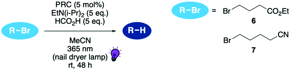 We next employed the cavity-bound PRCs PA-PhPT, PA-C4-PhPT and PA-C4-PT in the reductive dehalogenation of ethyl 4-bromobutanoate (6) and 5-bromopentanenitrile (7) and compared the results to PhPT and MePT (see Fig. 1B) under identical conditions. We used 5 mol% of the PRC and five equivalents each of diisopropylethylamine and formic acid in acetonitrile (Table 1).21 As a light source we used a cheap and widely available nail dryer lamp with an emission maximum of the bulb at 365 nm (for experimental setup see the ESI†). This lamp has a lower photon flux compared to typical LED setups used in the literature, which we determined using ferrioxalate actinometry40 as a simple yet accurate method (see the ESI† for details and comparative values). Hence for the debromination of 6 and 7 using PhPT as PRC, the yield within 48 h amounted to 29% and 28% (entry 1), respectively, while 81% was obtained after 24 h for 6 in the literature using the higher flux LED setup. Using MePT we obtained 17% and 16% yield, respectively, using our setup due to the lower stability of its excited and/or oxidized state compared to PhPT28 (entry 2). Simply adding decamethoxypillar[5]arene (1) to the reaction with MePT did not expedite its course (entry 3), and the presence of sole pillarene 1 did not lead to any transformation (entry 4). Using the cavity-bound PRCs PA-PhPT, PA-C4-PhPT and PA-C4-PT, on the other hand, led to significant increases in yield by factors of 1.6–3.8 compared to PhPT and MePT (entries 5–7). A particularly large improvement is observed for PA-C4-PT with 2.9 and 3.8 times higher yields, respectively, compared to MePT (entry 6); however, this catalyst was slightly less stable towards decomposition compared to the other catalysts due to the alkyl substitution on the phenothiazine nitrogen atom. The best overall performance was observed for PA-C4-PhPT and PA-PhPT with aryl substituents on the phenothiazine nitrogen atoms. Of these two, PA-PhPT is easier to synthesize in a gram scale, since no column chromatography is necessary in the purification of the PT-precursor, and this catalyst could also be recovered quantitatively after each photoredox-catalysed transformation. The increase in reaction rate can also be seen from the kinetic profiles comparing the rates of the dehalogenation of bromopentanenitrile (7) with PA-PhPT and PhPT (see the ESI†).