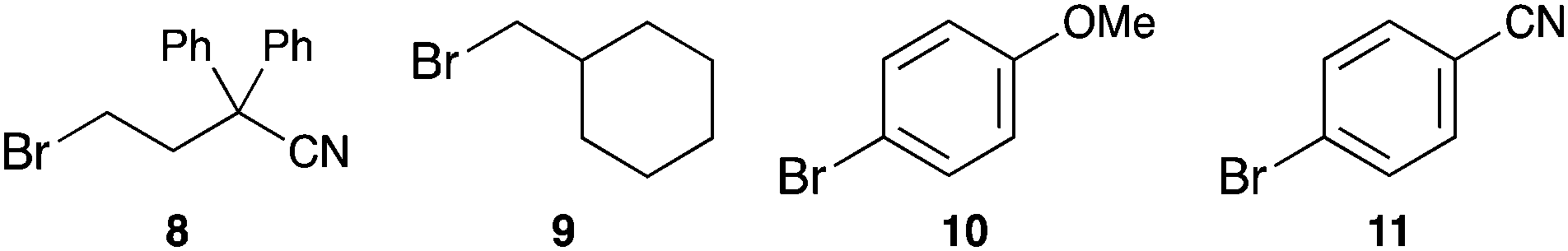To further prove the postulated concept we performed reactions using four substrates that are sterically hindered and cannot bind inside the pillar[5]arene cavity, namely 4-bromo-2,2-diphenylbutanenitrile (8), (bromomethyl)cyclohexane (9), 4-bromoanisole (10) and 4-bromobenzonitrile (11). We used both the pillarene-bound phenothiazine catalysts PA-PhPT and PA-C4-PhPT as well as PhPT as a cavity-free catalyst (Table 2). In each of these cases we obtained a similar yield for the reductive dehalogenation between the three catalysts (compare entries 1–3 for each substrate in Table 2). The slightly lower yields for PA-PhPT can be rationalized by the lower conformational flexibility of the phenothiazine unit due to the rigid phenylene linker to the pillar[5]arene. These comparative experiments demonstrate that when the substrate is unable to bind inside the cavity, the reaction rate remains similar between cavity- and non-cavity bound photoredox catalysts.