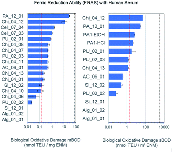 | | Fig. 2 Surface reactivity measured with the FRAS assay. Data are presented as mass based biological oxidative damage (mBOD, left). For a subset of the data the surface-based biological oxidative damage was calculated (sBOD, right); an average specific surface area was used for the negative control. No displayed bar (Si_12_01, Alg_01_02 and Alg_01_01) corresponds to no significant signal. The red and black dashed lines display the negative and positive control respectively. | |