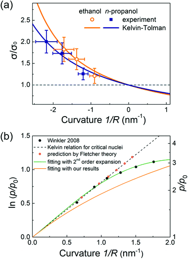 | Fig. 4 (a) The normalized ratio of surface tension σ/σ0. The larger surface tension is obtained for the smaller nanomeniscus, which equivalently implies that the smaller nanodroplet of positive curvature has smaller surface tension than the bulk value σ0. (b) The curvature-dependent surface tension is employed in the results of the HEN rate measurement of ref. 7. Fitting with the second-order expansion of surface tension gives two coefficients, δ∞ = −0.18 nm and (δ∞2 + α)/4 = 0.19 nm2, which provides excellent agreement, but deviates from our result due to the temperature difference. | ||