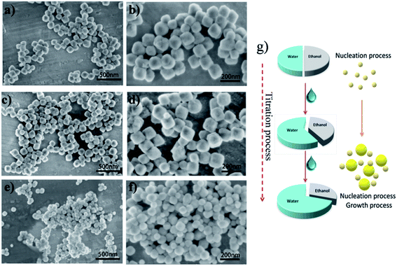 In order to further optimize the reaction conditions of the co-precipitation process, the solvent ratio of the KF additive was also studied. The SEM images of KMnF3 nanoparticles prepared with different solvent ratios of the additive solution are shown in Fig. 2a–f. When the solvent of the additive solution is ethanol, the lower surface tension of ethanol can reduce the critical size of nucleation and increase the nucleation rate sharply, triggering particle agglomeration. When the solvent of the additive liquid is distilled water, the schematic diagram of the process is shown in Fig. 2g. In the early stage of the titration process, when the additive liquid is in contact with the manganese acetate solution, the ethanol in the manganese acetate solution can be diluted to help provide an appropriate nucleation rate, and a controllable nucleation process will occur. As the titration process progresses, part of the nucleation process has been completed and then the growth process begins. At this time, the nucleation and growth processes coexist, and the process is complicated. With the continuous dripping of the additive liquid, it will have a continuous and slow inhibitory effect on the nucleation rate, which is extremely beneficial to the production of uniformly dispersed particles.