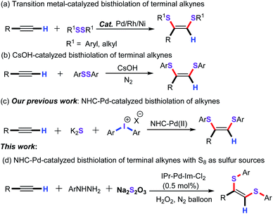 In conclusion, we have established a novel and efficient palladium-catalyzed three-component cascade bisthiolation of terminal alkynes and arylhydrazines with Na2S2O3 as the sulfur source for the assembly of functionalized (Z)-1,2-bis(arylthio)alkene derivatives in good to excellent yields with high regioselectivity. This protocol features mild conditions, excellent regioselectivity and good functional group tolerance. Prominently, H2O2 as the green oxidant and IPr–Pd–Im–Cl2 as the catalyst play an essential role in this protocol. Notably, in the presence of 0.5 mol% of IPr–Pd–Im–Cl2 as the catalyst, a wide range of alkynes and various arylhydrazines are excellently tolerated. Preliminary mechanistic studies suggest that the sodium thiophenolate might be involved in this transformation.