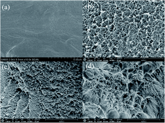 | | Fig. 2 SEM images of triarylimidazole-containing PI and nanocomposite films (a) PI(MPBAI-CBDA), (b) PI(SiO2-2.50%), (c) PI(Al2O3-2.50%), (d) PI(Si3N4-2.50%). | |