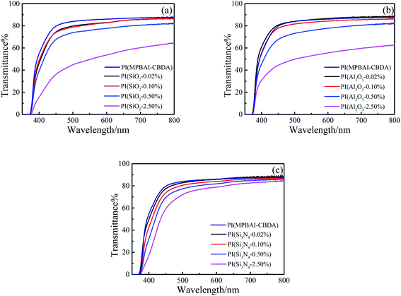 According to our reported procedure,47 the diamine MPBAI was synthesized and polymerized with alicyclic dianhydride CBDA to prepare the colorless and transparent PI film by thermal imidization. Next, the three series of nanocomposite films were fabricated by in situ polymerization using nano-SiO2, Al2O3 and Si3N4 as inorganic nanofillers. In each nanocomposite films, the loadings of nanofillers were designed as 0.02%, 0.10%, 0.50% and 2.50%, respectively. Fig. 1 gives the FTIR spectra of PI(MPBAI-CBDA) and nanocomposite films, from which there are three characteristic peaks of imide ring at 1780, 1712 and 1372 cm−1, corresponding to the asymmetric and symmetric stretching vibration of C