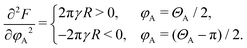 Assuming that φA and φR are independent, dF is zero when φA = ΘA/2 + nπ/2 and φR = −ΘR/2 + mπ/2, where n = −1 or 0, and m = 0 or 1 such that −π/2 ≤ φA ≤ π/2 and −π/2 ≤ φR ≤ π/2, respectively. To determine whether these solutions correspond to a minimum (downward capillary force pulling particle towards liquid) or a maximum (upward capillary force pushing particle out of liquid), we calculate the second derivatives of F: