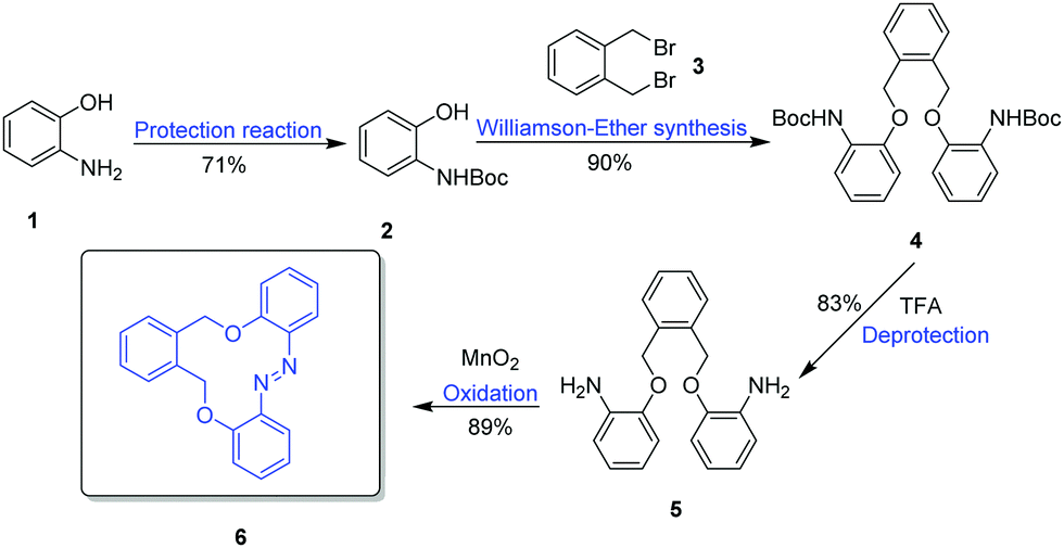 The synthesis started with the protection of commercially available amino phenol 1 with Boc anhydride (Boc2O) to obtain 2 in a yield of 71%, followed by a Williamson ether synthesis reaction with 1,2-bis(bromomethyl)benzene 3 (Scheme 1). Deprotection of 4, and an intramolecular cyclization oxidation reaction of compound 5 by MnO2 gave the azobenzene macrocycle 6(E) in a yield of 89%.