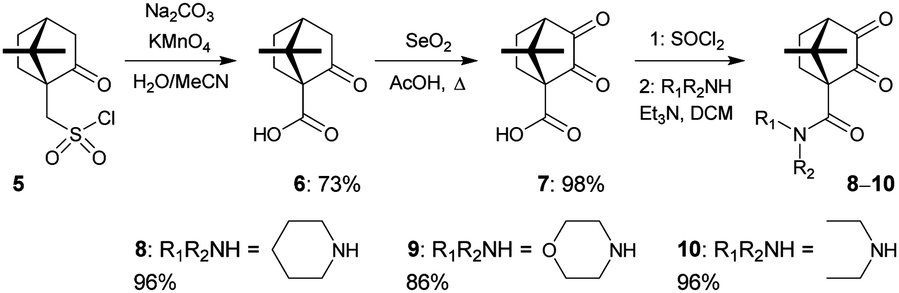 We chose enantiomerically pure and inexpensive (+)-10-camphorsulfonyl chloride 5 as the starting material for the synthesis of the novel diketones to avoid the possibility of diastereomer formation during ligand synthesis, and to maximize the extraction of metal ions.11 Compound 6 was synthesized in 73% yield from 5 following the literature procedure,12 and converted into the known diketone 7 in 98% yield.13 The novel diketones 8–10 were then obtained from 7 and three representative secondary amines in 86–96% yields (Scheme 1).